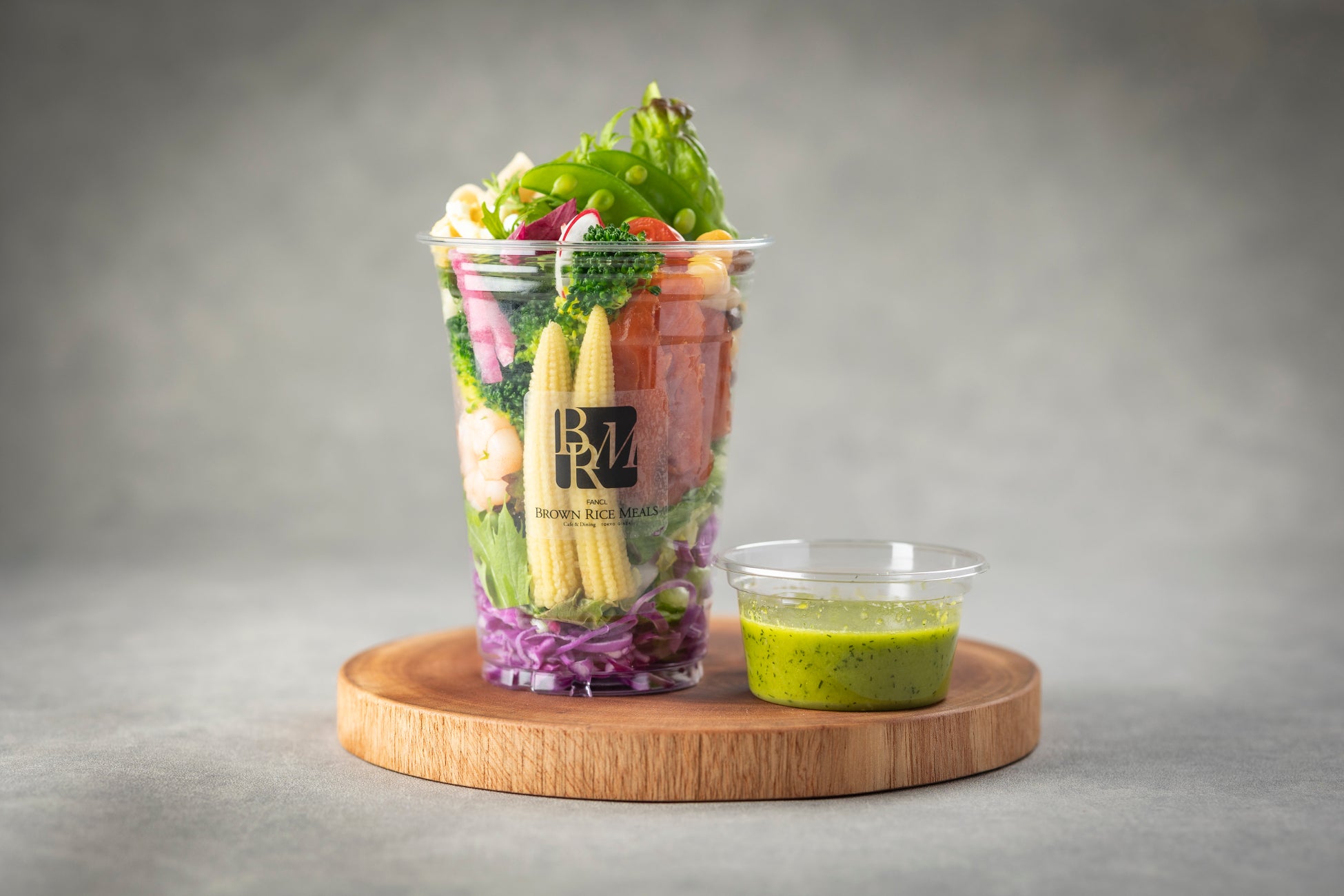 ・特長:レストランで大人気のメニューをカップサラダでご提供します。たっぷり彩り野菜に、スモークサーモンや玄米マカロニをトッピング、爽やかなハーブ&FANCLケール青汁を使用したドレッシングでお召し上がりください。