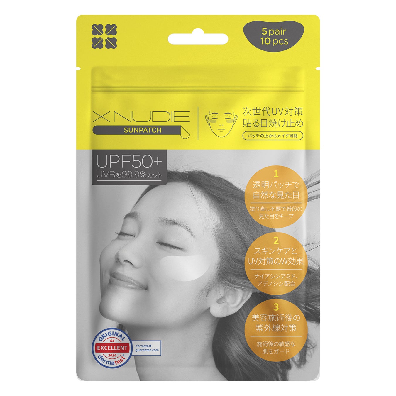 ●『貼る』ことで肌を守る新しいUVカット商品(商品区分:化粧品) 「XNUDIEサンパッチクリア」(※以下サンパッチ)は、「貼る」と言う新しい 概念を取り入れた次世代UVケア商品であり、 この1 枚でUVカット、スキンケア、シミカバーの1 枚3 役を可能とします。 美容成分を配合した物理的なバリアで紫外線を99.9%カット(UPF50+) ※UV-B99.9%、UV-Aを94.9%