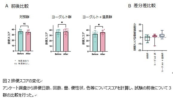 その結果、健康への関与がよく報告されている腸内細菌には大きな変化はみられませんでしたが、ヨーグルト+温泉群において、試験後に有意に排便スコアが増加しました。また、ヨーグルト群でも同様の結果がみられました(図2A)。加えて、ヨーグルト群に比べてヨーグルト+温泉群では排便スコアの増加が大きい傾向がみられました(図2B)。以上の結果により、ヨーグルト群とヨーグルト+温泉群では介入による排便状況の改善が示唆されました。