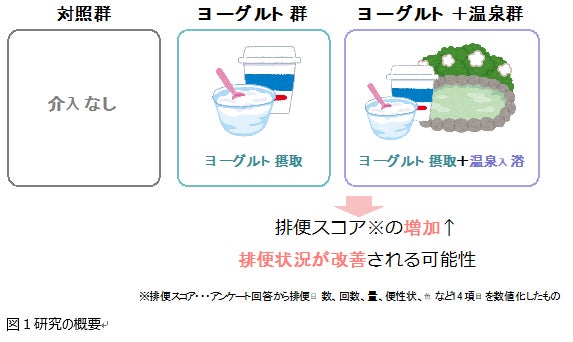 本研究では、ヨーグルト摂取やヨーグルト摂取後の温泉入浴が共に排便状況の改善につながることを初めて明らかにしました。