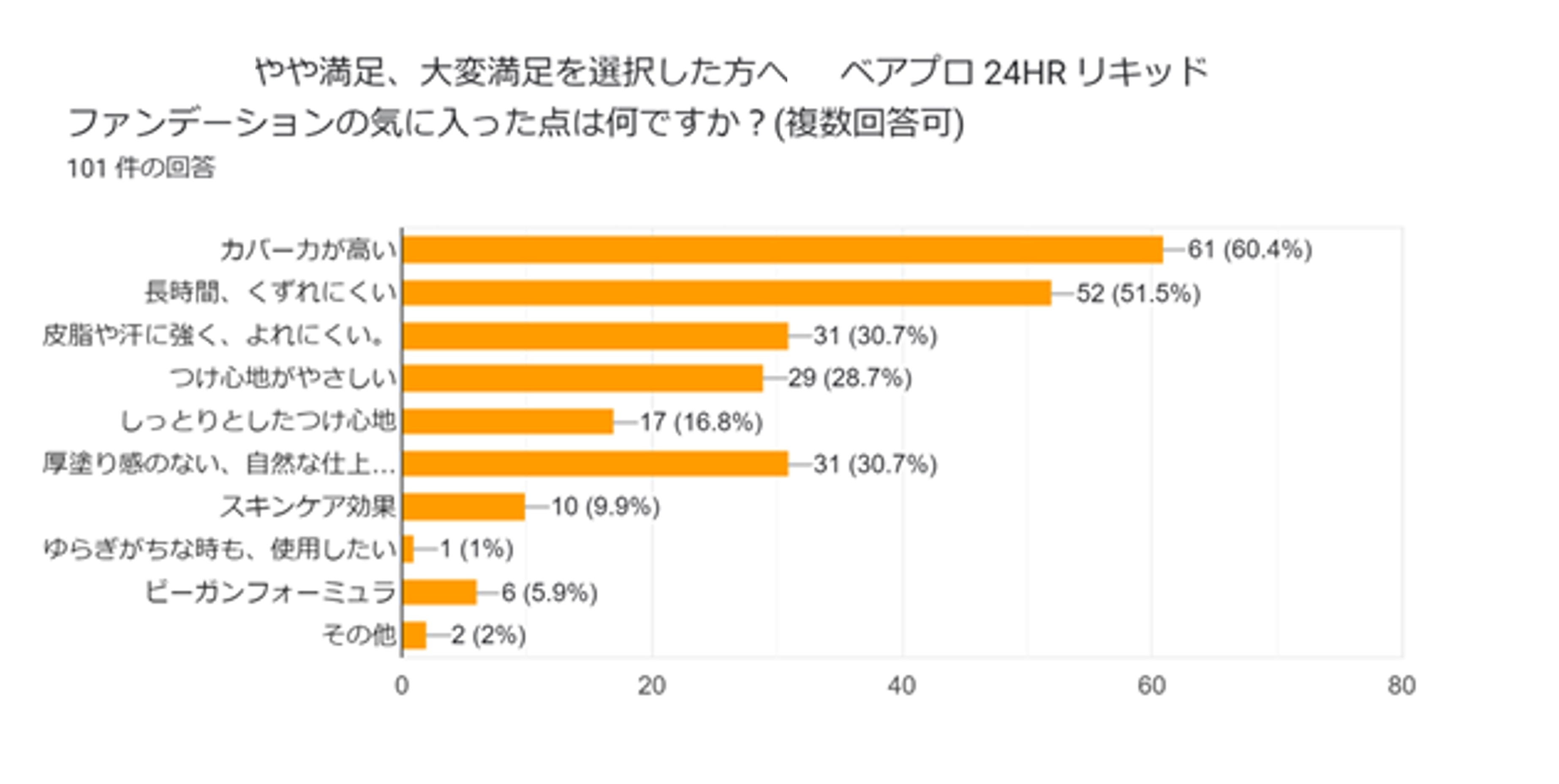 ◆チアリーダーズの「ベアプロ 24HR リキッド ファンデーション」の気に入った点として、「カバー力の高さ」61%、「長時間崩れにくい」52%と回答。