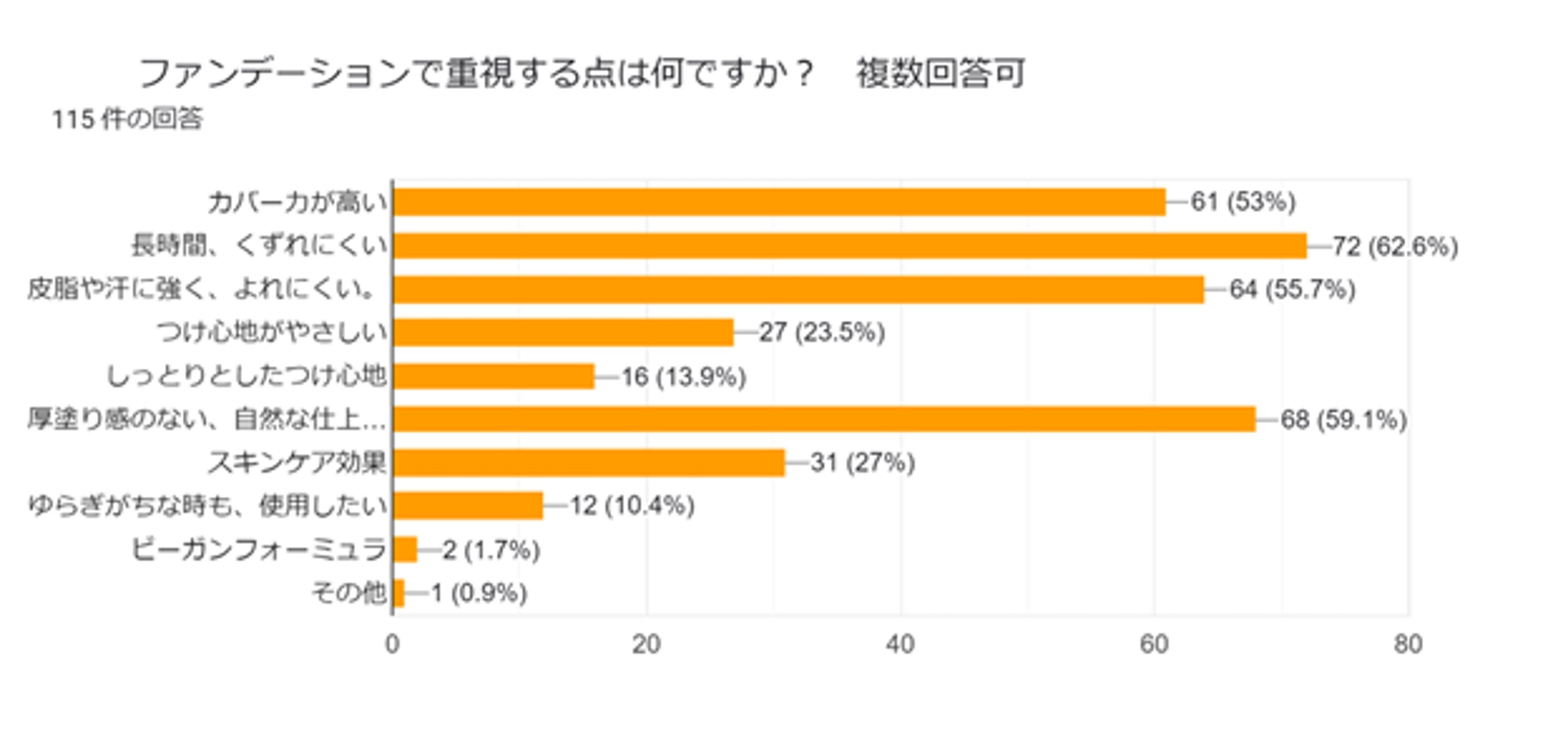 ◆チアリーダーズのファンデーションで重視する点は、「長時間の崩れにくさ」72%、次いで「厚塗り感のない自然な仕上がり」68%、「皮脂や汗に強く、よれにくい。」64%