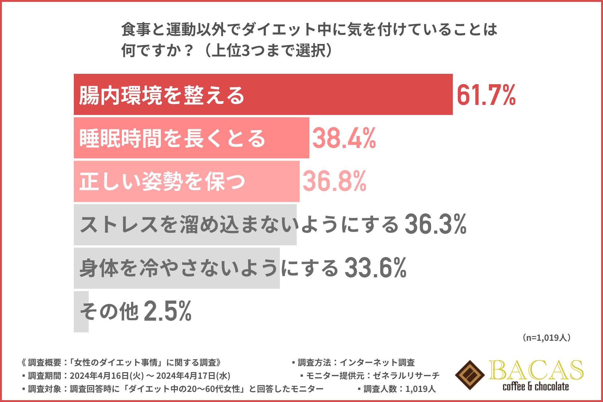 続いて、「食事と運動以外でダイエット中に気を付けていることは何ですか?(上位3つまで選択)」と質問したところ、『腸内環境を整える(61.7%)』と回答した方が最も多く、次いで『睡眠時間を長くとる(38.4%)』『正しい姿勢を保つ(36.8%)』と続きました。