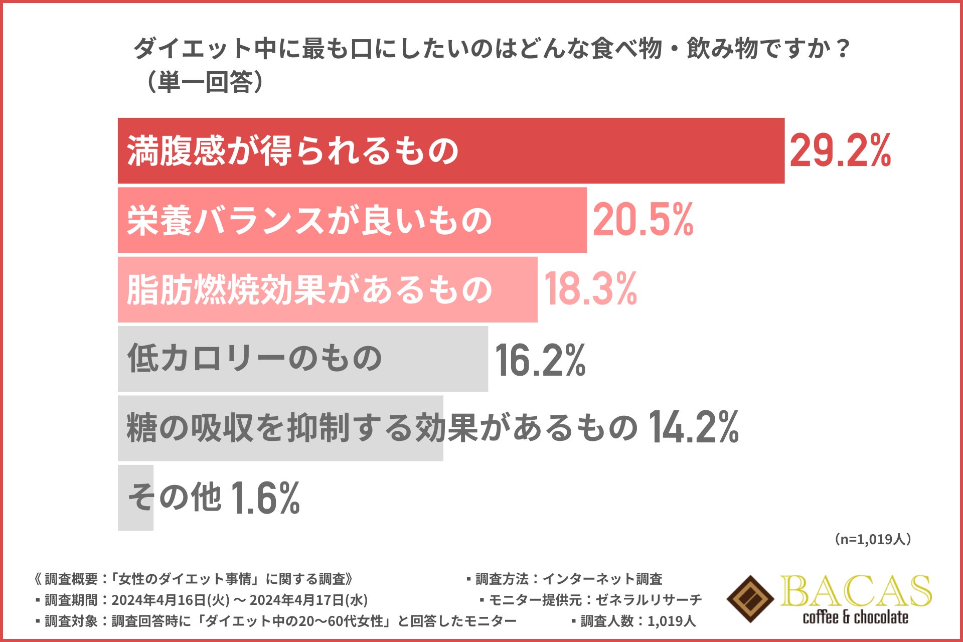 「ダイエット中に最も口にしたいのはどんな食べ物・飲み物ですか?(単一回答)」と質問したところ、『満腹感が得られるもの(29.2%)』と回答した方が最も多く、次いで『栄養バランスが良いもの(20.5%)』『脂肪燃焼効果があるもの(18.3%)』と続きました。