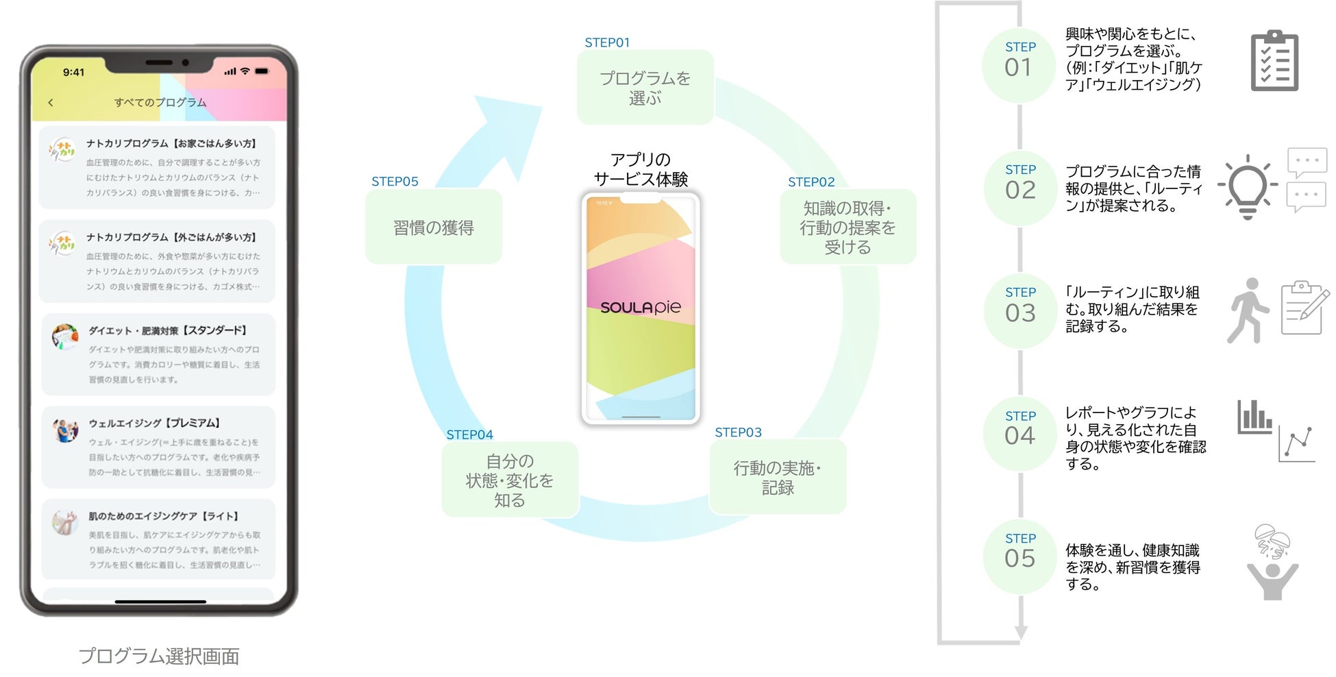 SOULA株式会社(本社:東京都港区、代表取締役社長:木下直人、以下SOULA)と、カゴメ株式会社(本社:愛知県名古屋市、代表取締役社長:山口 聡、以下カゴメ)は、両社の知見とノウハウを融合し、減塩のための食習慣アプリ「ナトカリプログラム」を共同開発しました。ナトカリプログラムは、SOULAが企業・団体向けに販売しているヘルスケア導入支援アプリ『SOULA pie(読み:ソウラ パイ)』に標準搭載、2024年5月15日より販売を開始します。
