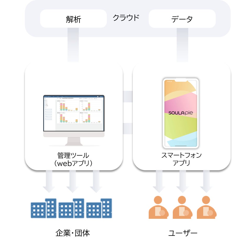 SOULA pie は、クラウド型アプリサービスの提供を通じ、企業や団体におけるヘルスケアサービスの効率的導入と運用をサポートします。