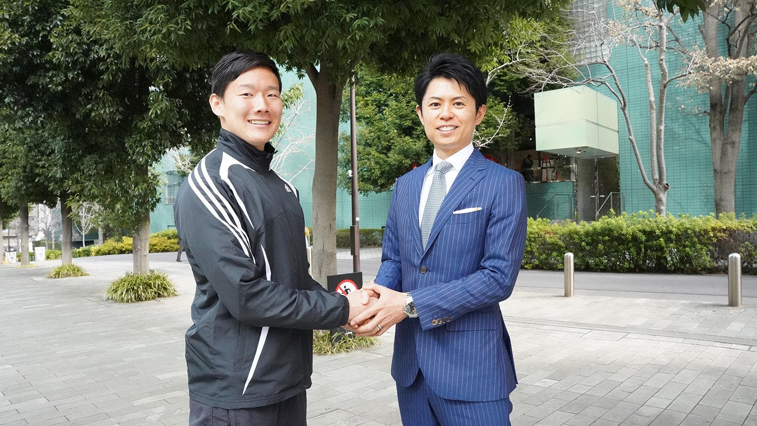 フィールドホッケー・中村航司選手 (ドイツブンデスリーガ2部)と株式会社サムライフ 代表取締役 坂田武士とで、「専属予防医学マイスター契約」の調印式が行われました。
