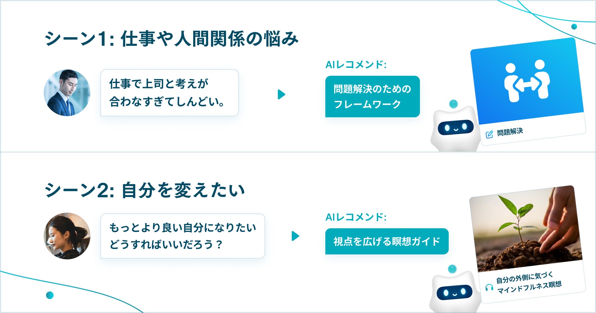 これらの豊富なコンテンツを、ユーザーの心の状態や悩みに応じて適切におすすめできるようにしたのが「AIレコメンド」です。