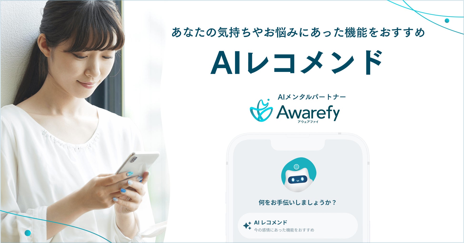 「心の健康と成長を支えるデジタル・メンタル・プラットフォームを実現する」をミッションに、AI メンタルパートナー「アウェアファイ」の企画・開発・運営を行う株式会社Awarefy(本社:東京都新宿区、代表取締役 CEO 小川 晋一郎)は、心の悩みにあった解決策を提案する「AIレコメンド」機能をリリースいたしました。