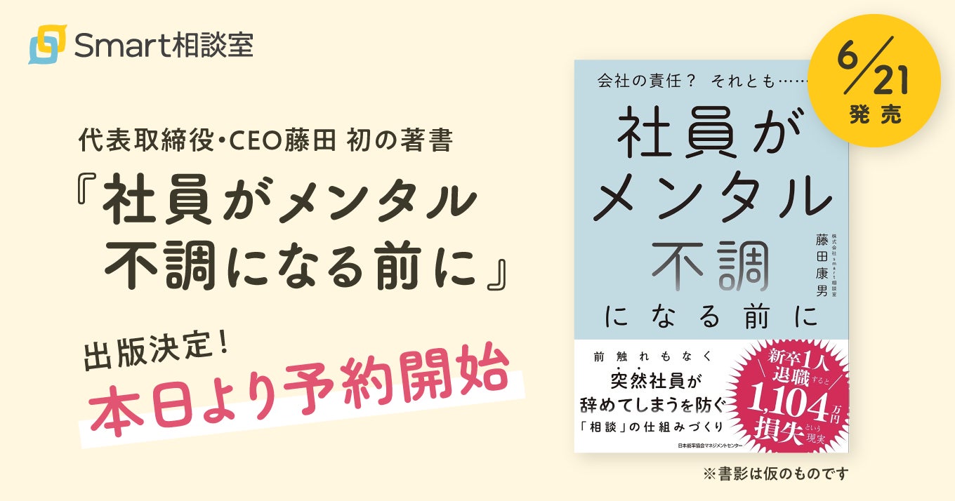 法人向けオンライン対人支援サービスを提供する株式会社Smart相談室(本社:東京都港区、代表取締役・CEO:藤田 康男)は、代表取締役・藤田康男の著書『社員がメンタル不調になる前に』(出版元:株式会社日本能率協会マネジメントセンター)を2024年6月21日に出版します。本書は、5月15日よりAmazon他オンライン書店にて予約を受け付けています。