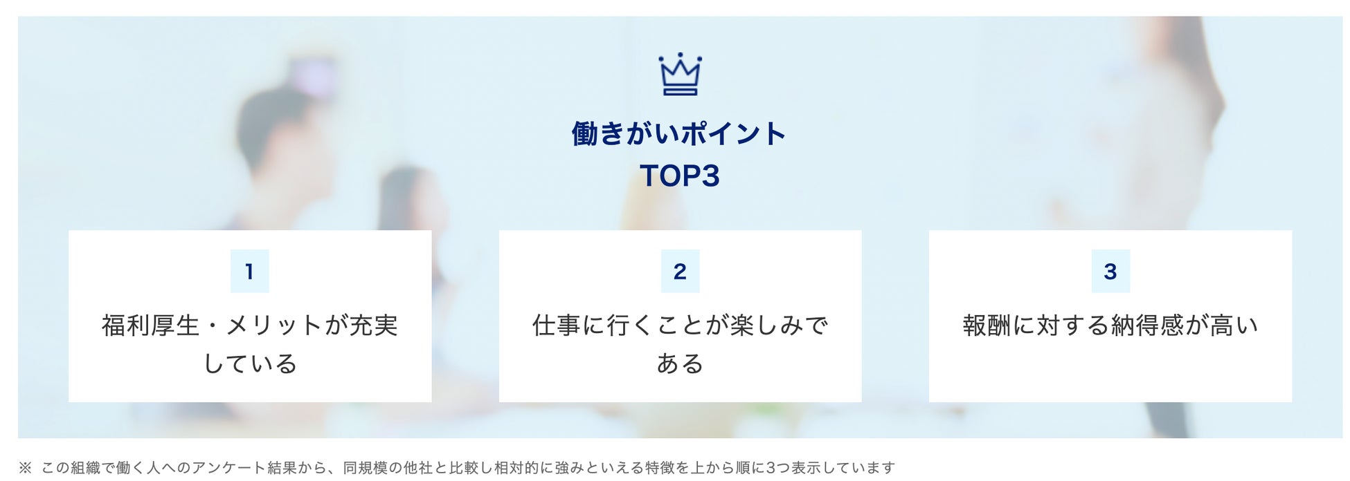 今回の調査では「この会社は、福利厚生・メリットが充実している」「この会社は、仕事に行くのことが楽しみである」「この会社は、報酬に対する納得感が高い」といった3点が相対的に強みであると評価され、「働きがいのある会社」の認定となりました。