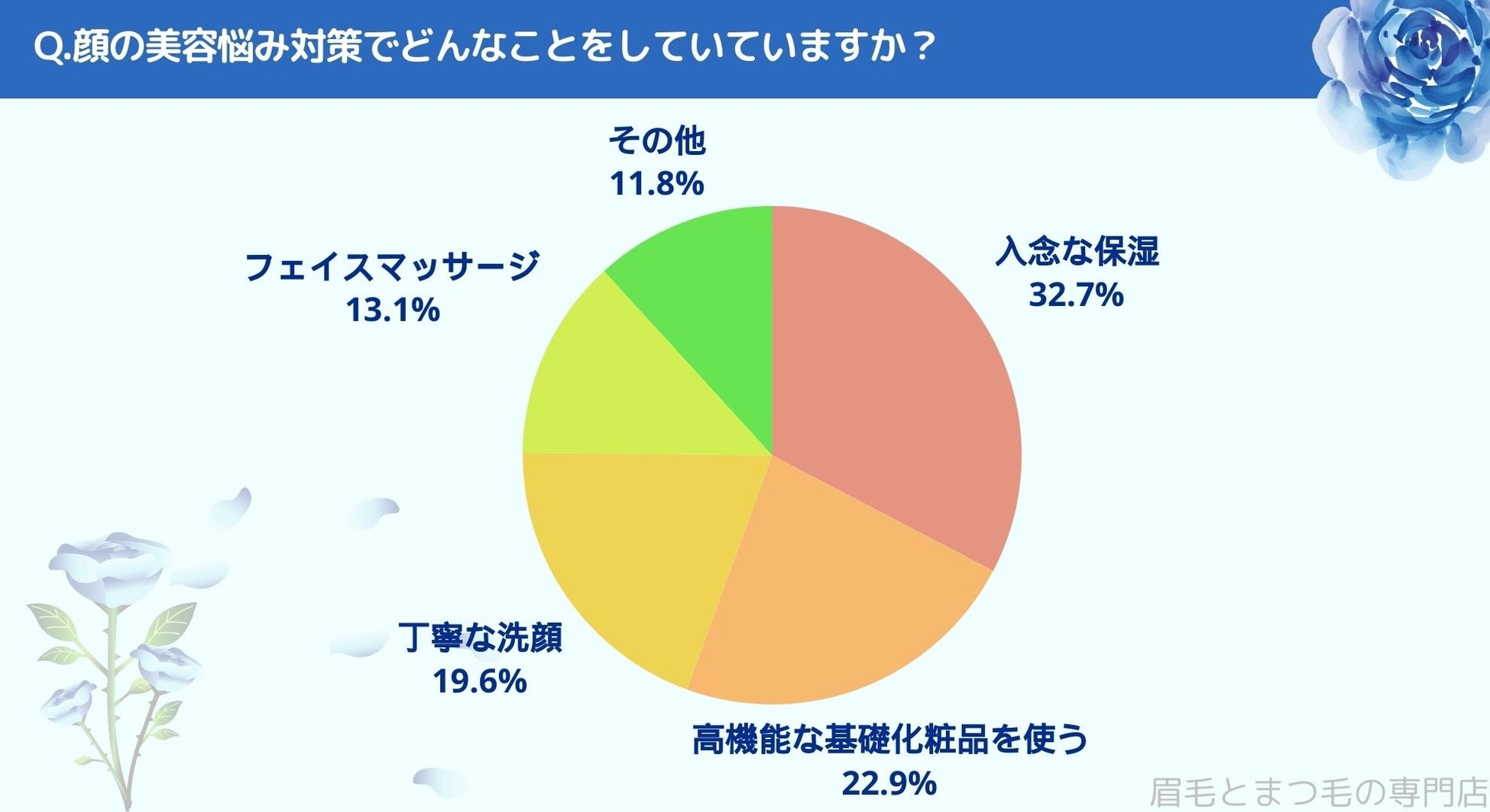 顔の美容悩みにどんな対策をしているかお聞きしたところ「入念な保湿(32.7%)」、「高機能な基礎化粧品を使う(22.9%)」、「丁寧な洗顔(19.6%)」、「フェイスマッサージ(12.1%)」という結果になりました。