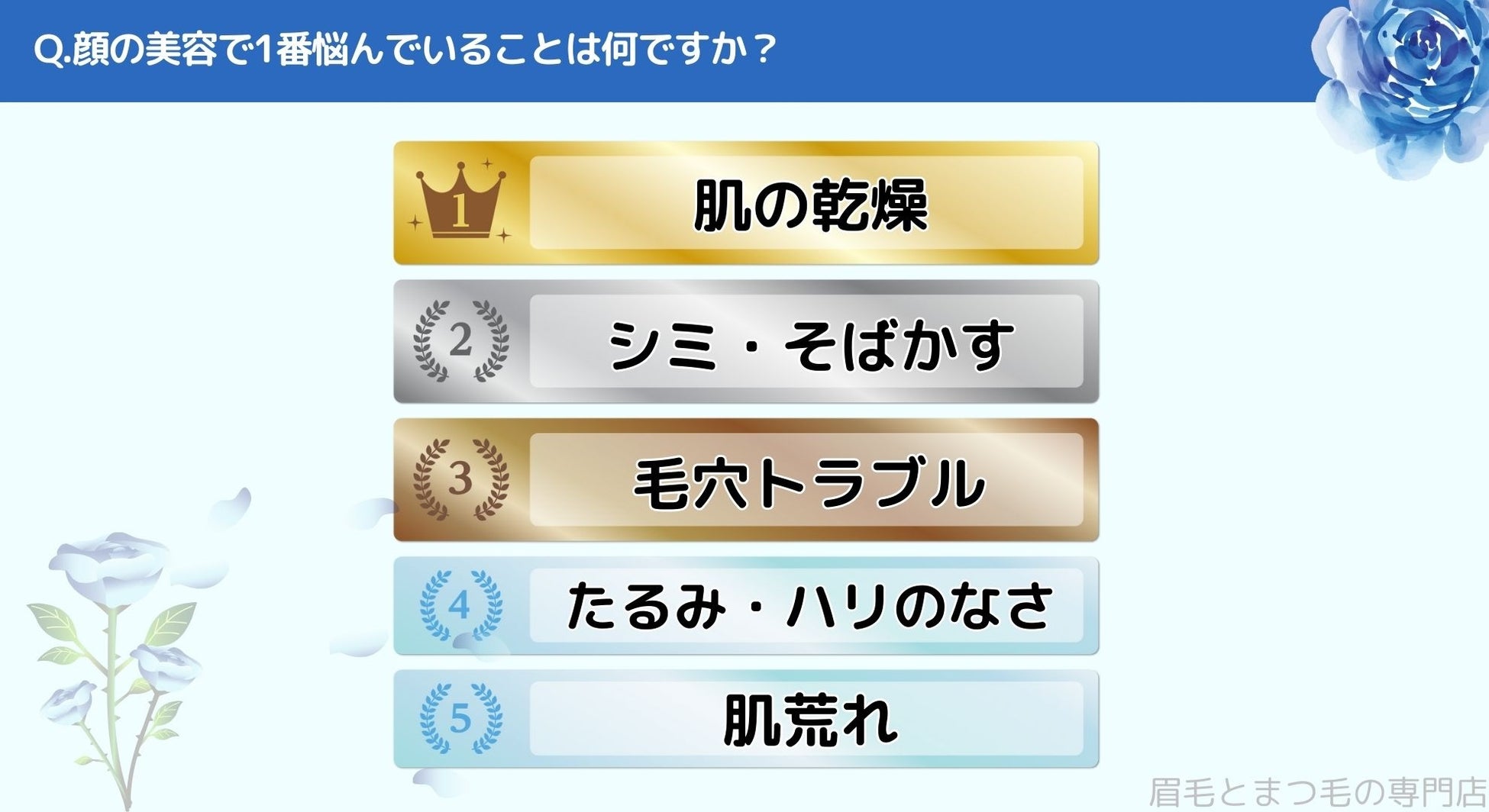 顔の美容悩みについてお聞きしたところ「1位>肌の乾燥」、「2位>シミ・そばかす」、「3位>毛穴トラブル」、「4位>たるみ・ハリのなさ」、「5位>肌荒れ」という結果になりました。