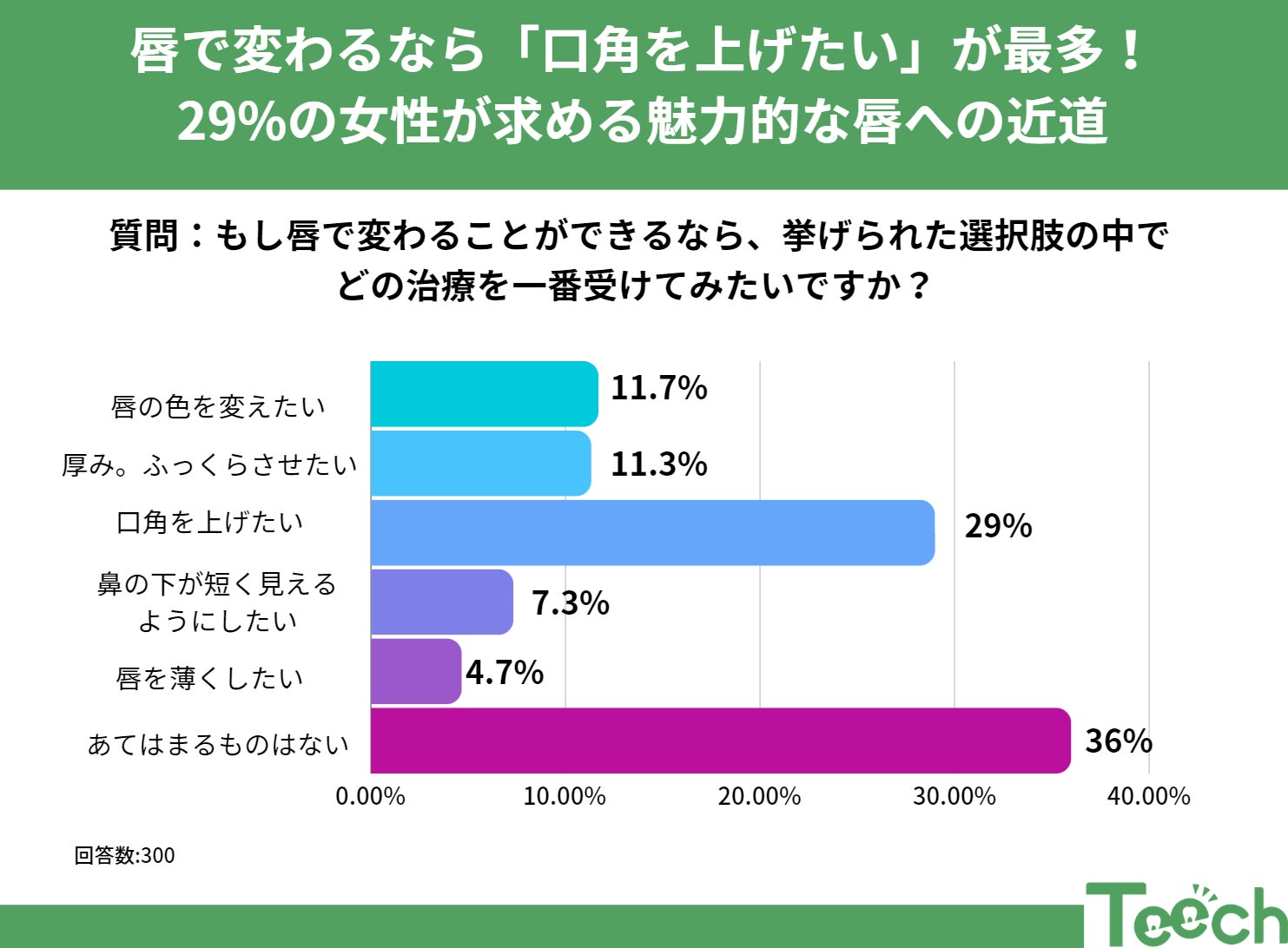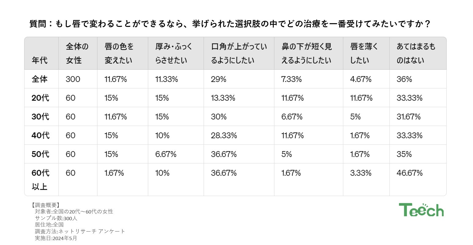 「もし唇で変わることができるなら、どの治療を受けたいですか?」この質問に対して、20代から60代の女性300人が彼女たちの唇の美容に対する願望を明かしました。