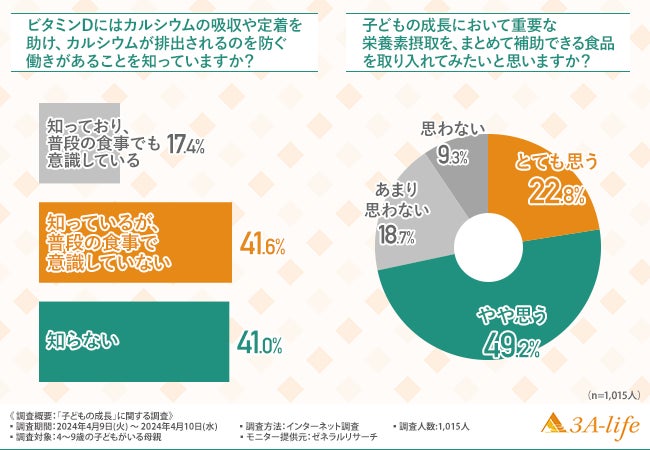 特に、成長において重要なカルシウムはビタミンDと共に摂取することの重要性を理解し、普段の食事においても意識できているのは2割以下であるということも明らかになりました。