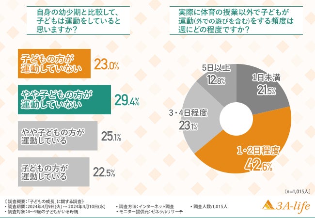 「子どもの方が運動していない」「やや子どもの方が運動していない」を合わせると約半数の方が、自身の幼少期よりも子どもたちが運動していないと感じていることが示されました。