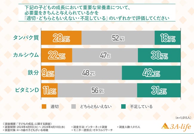「下記の子どもの成長において重要な栄養素について、必要量をきちんと与えられているかを適切・どちらともいえない・不足しているのいずれかで評価してください」と質問したところ、各項目について『適切』を選択した割合は『タンパク質(28.9%)』が最も多く、次いで『カルシウム(22.2%)』『ビタミンD(11.8%)』『鉄分(9.6%)』と続きました。