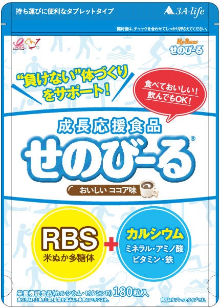 カルシウムや鉄分など4種類のミネラルをはじめ、ビタミンDなどの7種類のビタミン、RBS米ぬか多糖体をバランスよく含んだ「成長応援食品」です。