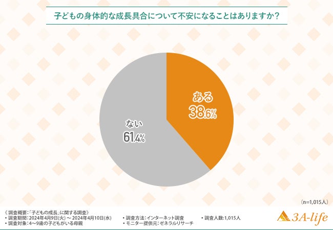 「子どもの身体的な成長具合について不安になることはありますか」と質問したところ、約4割の方が『ある(38.6%)』と回答しました。