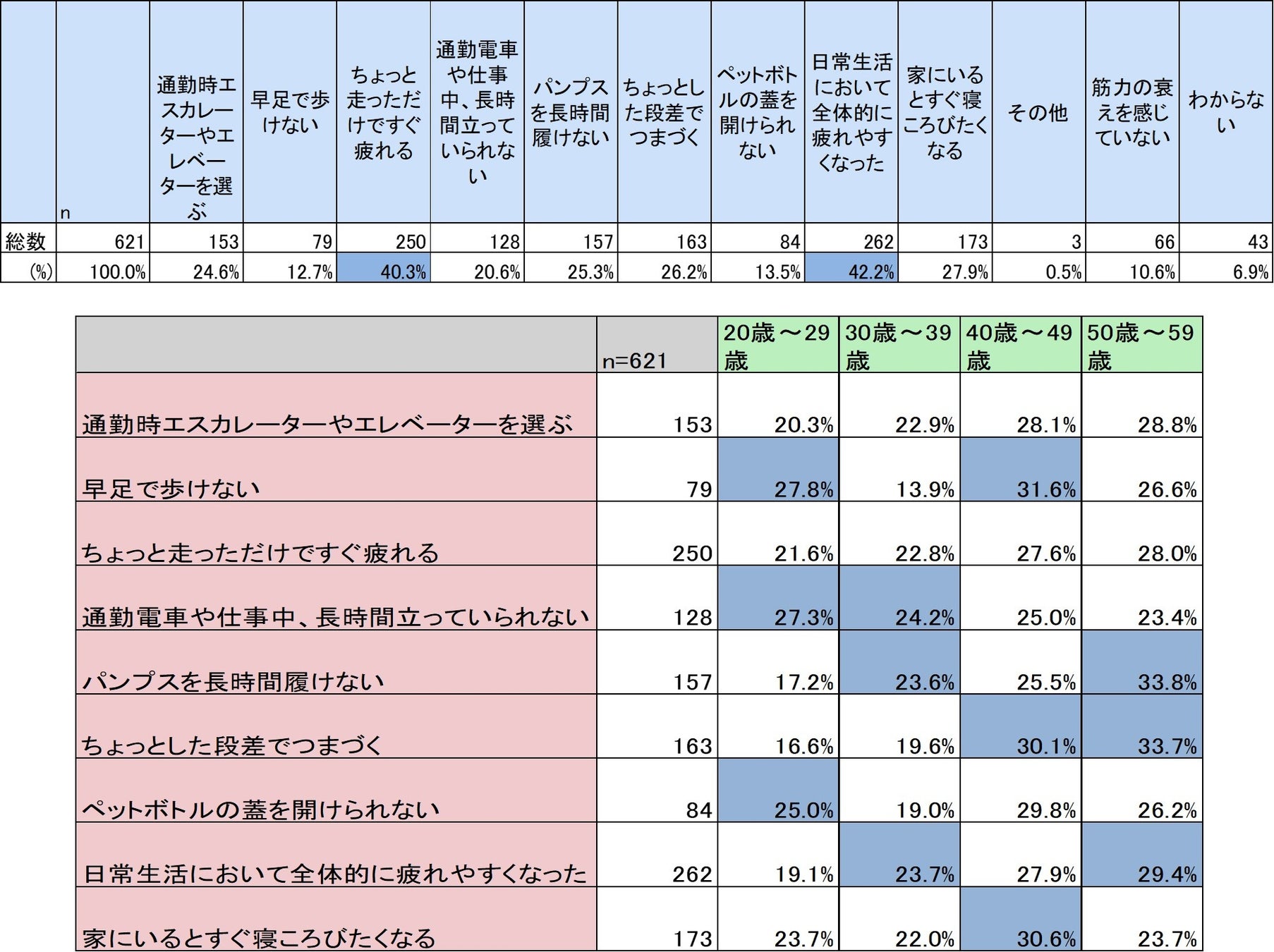 また、具体的には「日常生活において全体的に疲れている」「ちょっと走っただけで疲れる」人が40%以上いることがわかりました。年代別では、20代30代で「通勤電車や仕事中、長時間立っていられない」人が多く、40代、50代では「ちょっとした段差でつまずく」人が多いことがわかりました。