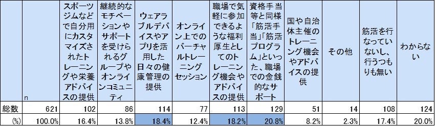 「どのようなサポートや情報があれば、筋活を継続できると思いますか?」という問いに対し、「資格手当等と同様「筋活手当」「筋活プログラム」といった、職場での金銭的なサポート」が1位で20.8%「職場で気軽に参加できるような福利厚生としてのトレーニング機会やアドバイスの提供」が2位で18.2%、3位が「ウェアラブルデバイスやアプリを活用した健康管理のフィードバックの提供」で18.4%でした。