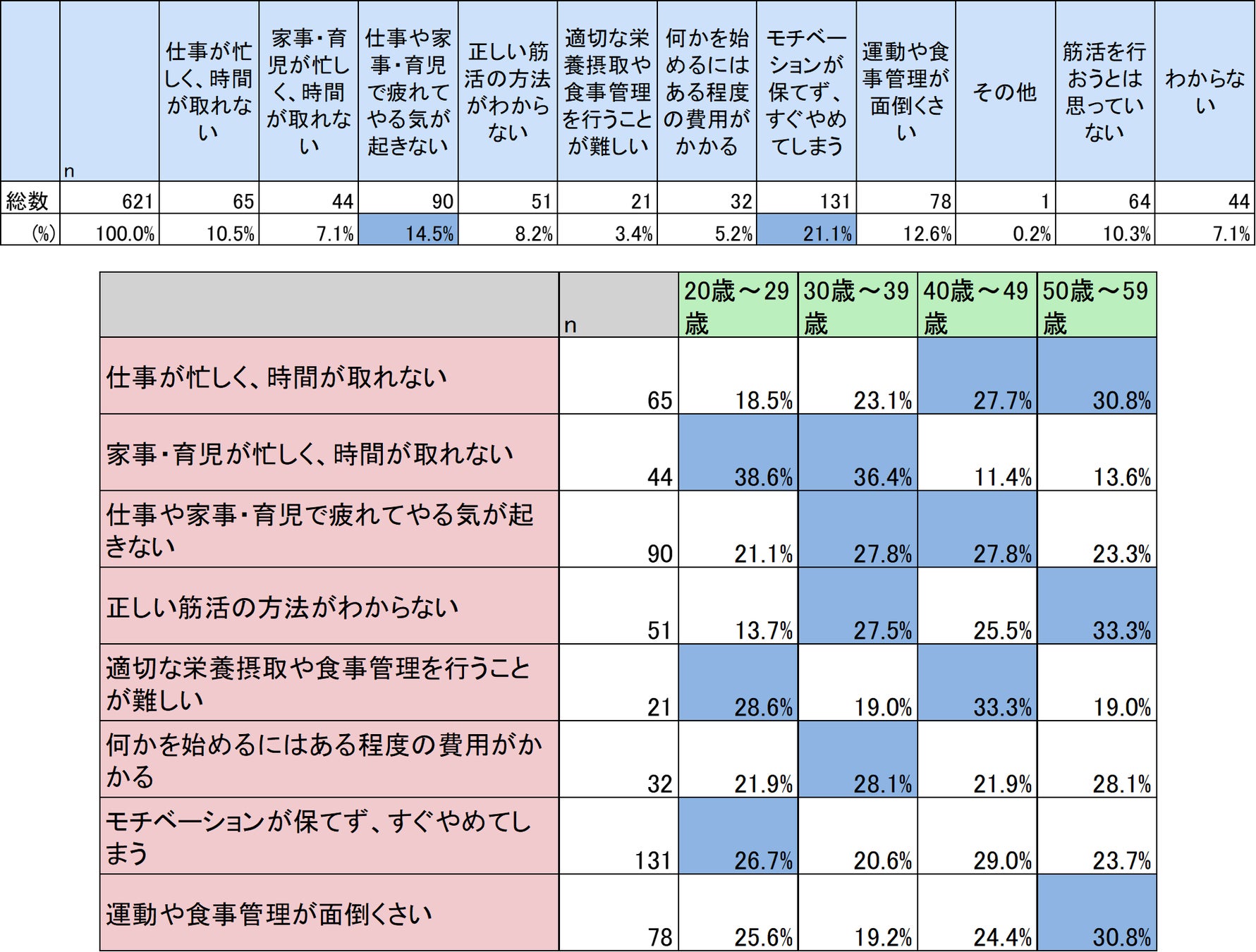 「筋活を行う上で最も困難だと感じる点を一つお選びください」という問いに対し、「モチベーションが保てず、すぐやめてしまう」と答えた人が21.1%で1位でした。また2位は「仕事や家事・育児で疲れてしまい、やる気が起きない」で14.5%でした。年代別で見ると、20代30代の1位は「家事・育児が忙しく、時間が取れない」、40代の1位は「適切な栄養摂取や食事管理を行うことが難しい」、50代の1位は「正しい筋活の方法がわからない」でした。日々の生活に疲れていることも一因ですが、正しい情報を求めていることもわかりました。