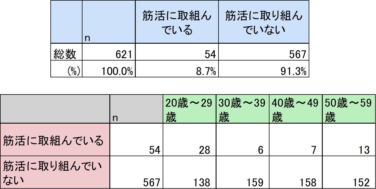 「あなたは「筋活」に取り組んでいますか?」という問いに対し、「筋活に取り組んでいる」と答えた人は8.2%でした。また、筋活に取り組んでいる人は20代が一番多く28人、次に多かったのは50代で13人でした。30代40代が少ないのは、子育て世代が多く、家事育児に追われて時間が取れないのが原因と考えられます。