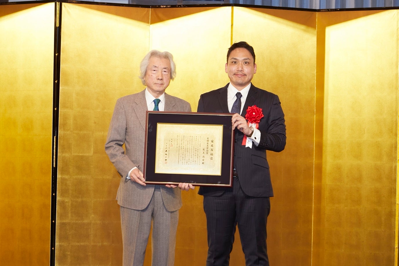 第28回安藤百福賞授賞式にて、小泉純一郎 食創会会長(元内閣総理大臣)から賞状を受け取る、当社代表・寄玉。
