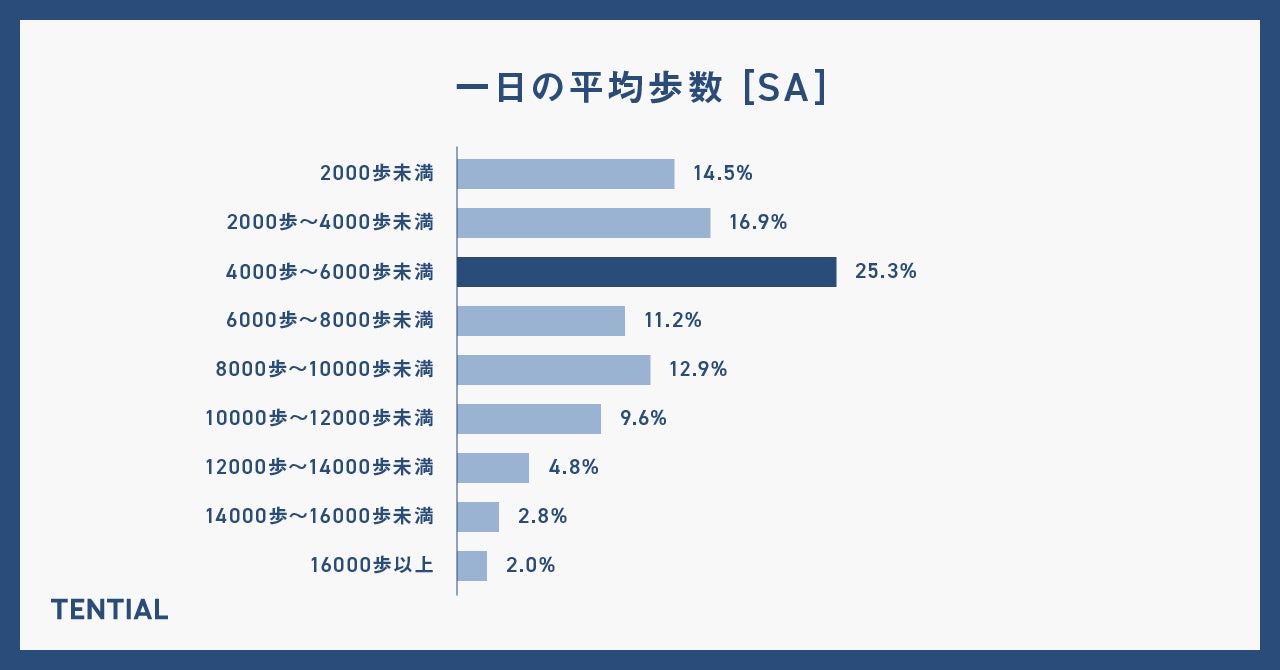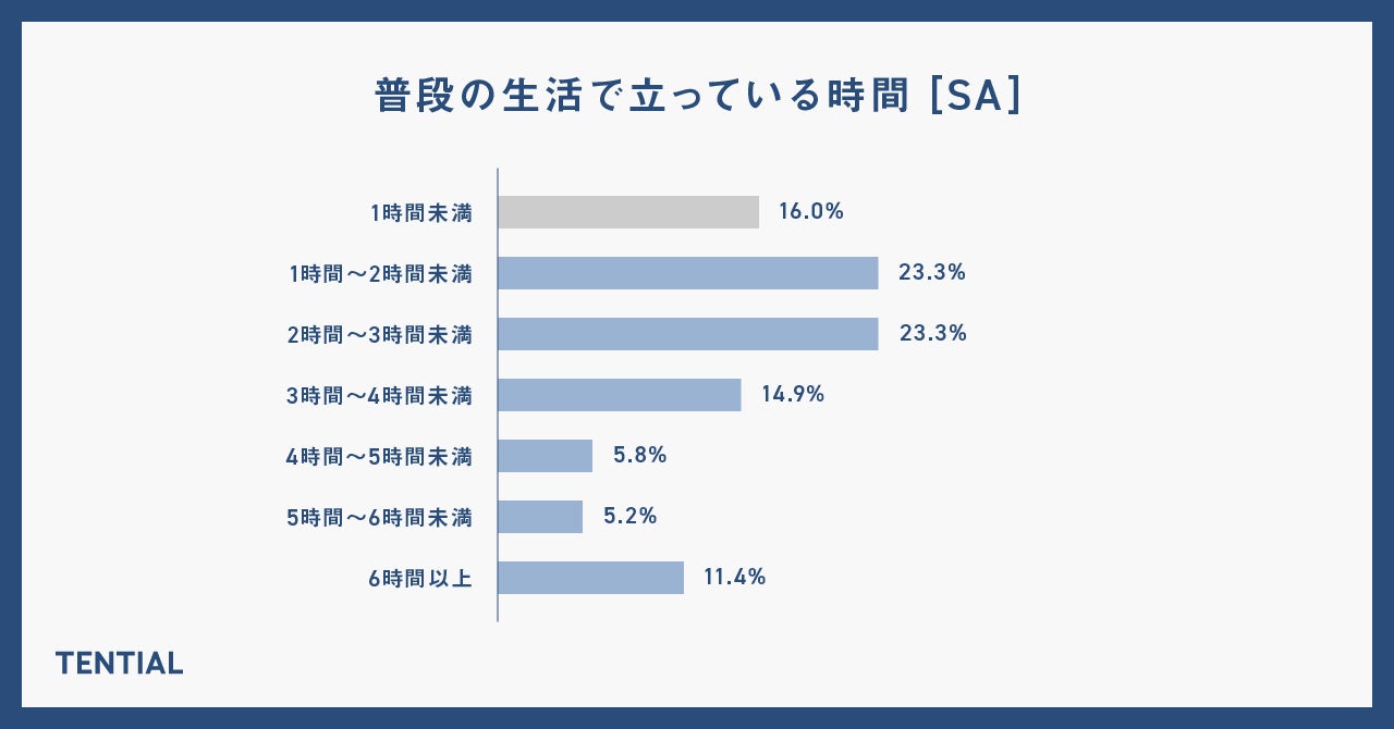 普段の生活の中で立っている時間は1〜3時間が最も多く、3時間以上立っている方も37.3%と3分の1以上にのぼります。1日の歩数としては4,000〜6,000歩の方が25.3%で一番多い傾向となりました。厚生労働省は1日の平均歩数として7,100歩を目標としており※1、目標値には届いていないことが明らかとなりました。