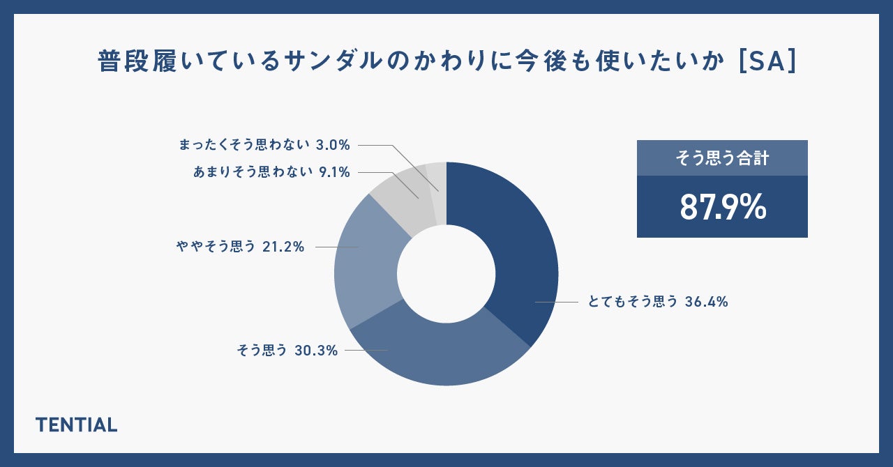 リカバリーサンダルは、普段履いているサンダルと比べた時に機能性が使用者の実感値として感じられやすい製品であることがわかりました。また、今後も使いたいと思う方が多くいることから、足の悩みを解決するサンダルのニーズがあることが伺えます。