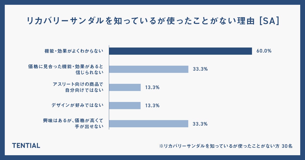 サンダルの機能面に目を向けると、「足の悩みに影響する」と答えた方が67.3%もいる中、機能性を特徴とする「リカバリーサンダル」を知っている方は13.1%と低い結果になりました。さらに、リカバリーサンダルを知っているが使ったことがない理由として「機能・効果がよくわからない」ことが最も高く(60.0%)、特徴である機能性が十分に伝わっていないことが購買決定に至らない理由であることが明らかになりました。