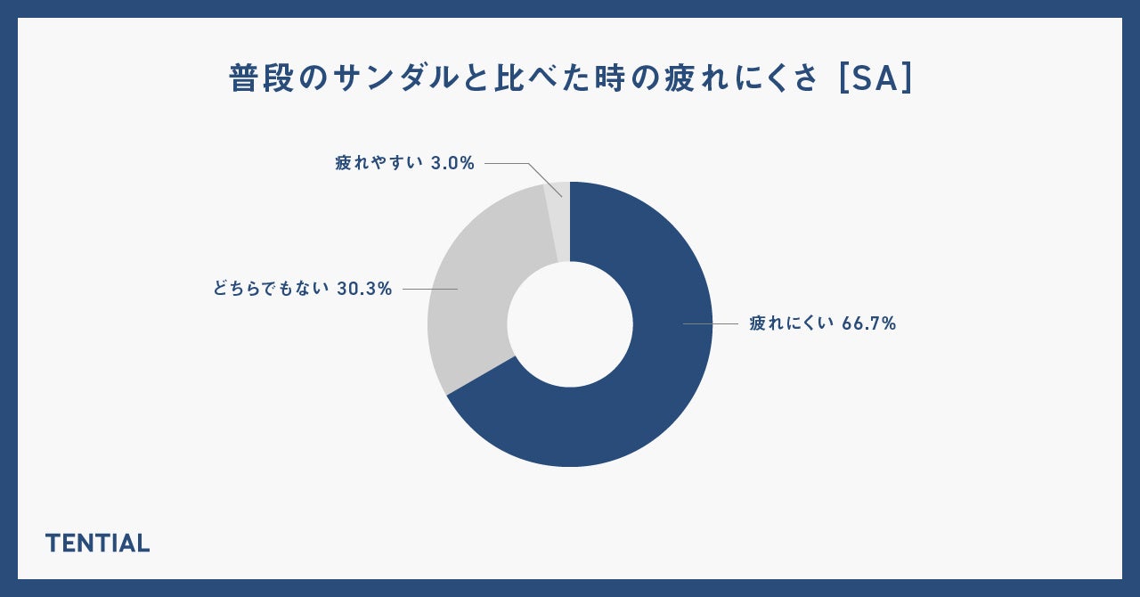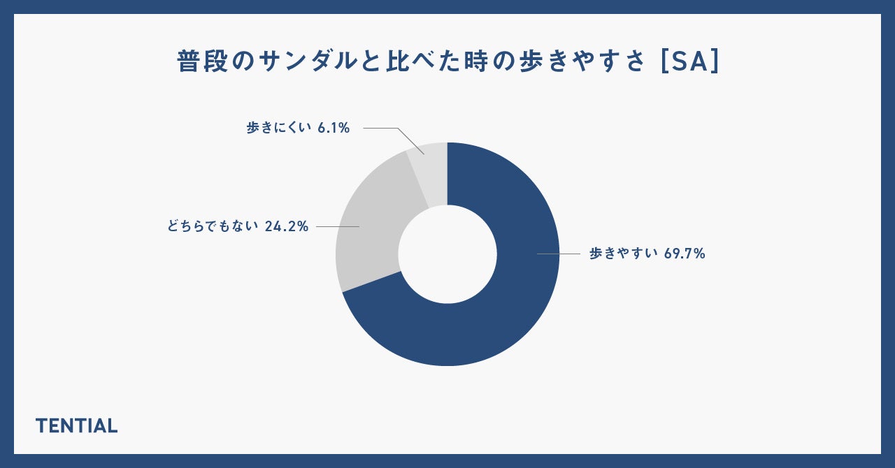 リカバリーサンダルは、普段履いているサンダルと比べて「歩きやすい」(69.7%)、「疲れにくい」(66.7%)と感じると約3分の2の方が回答。本製品の機能性が使用者の実感値として感じられやすいことが明らかとなりました。