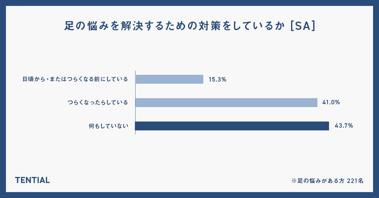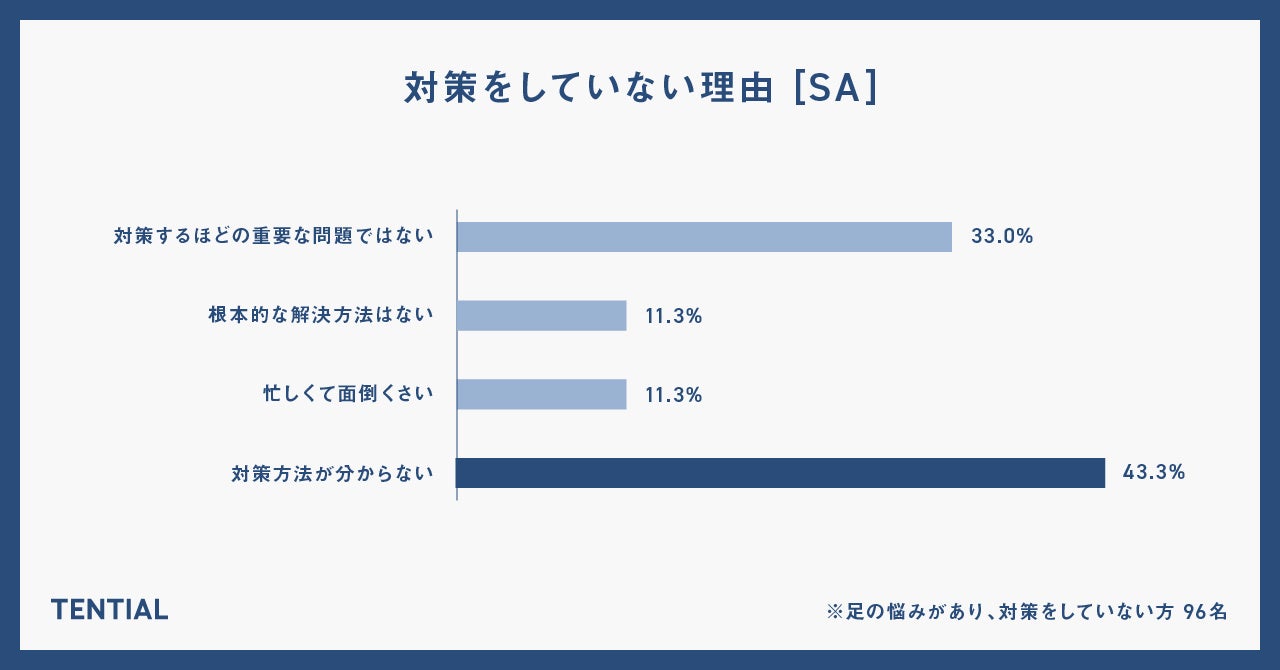 ・一方で、日頃から対策をしている人は15.3%しかいないことが判明。足の悩みがあるにも関わらず対策をしていない理由としては、「対策方法がわからない」ことが43.3%で最多。