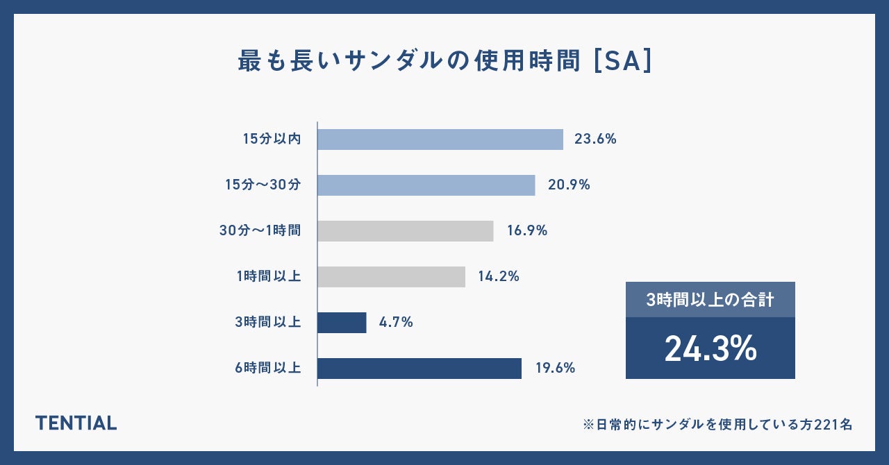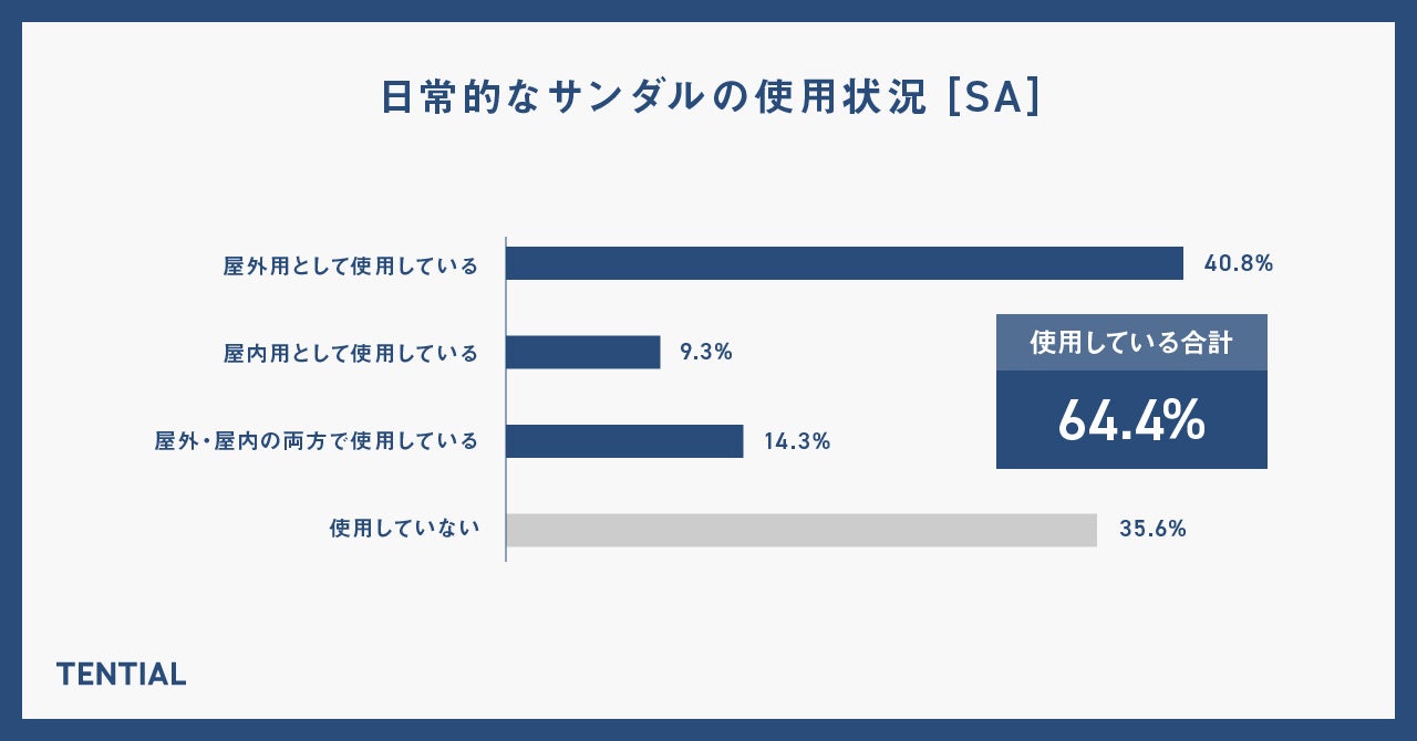 日常的にサンダルを使っている方は64.4%も存在しました。屋外での使用が最も多く、30分以内の短い時間の使用が最も多い一方で、3時間以上使う方も24.3%であることから、ライフスタイルに合った多種多様な活用方法があることが垣間見えました。また、通年で使う方も40.2%おり、サンダルを主要な履物として生活している方もみられました。