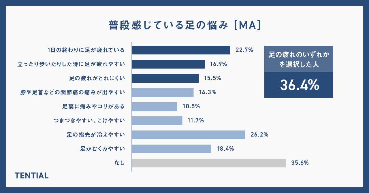 全体の65.4%の方が「普段から足の悩みを感じている」と回答しました。具体的には「1日の終わりに足が疲れている」「立ったり歩いたりした時に足が疲れやすい」「足の疲れがとれにくい」といった足の疲れに関する悩みを持つ方が全体の1/3以上いることが判明しました。