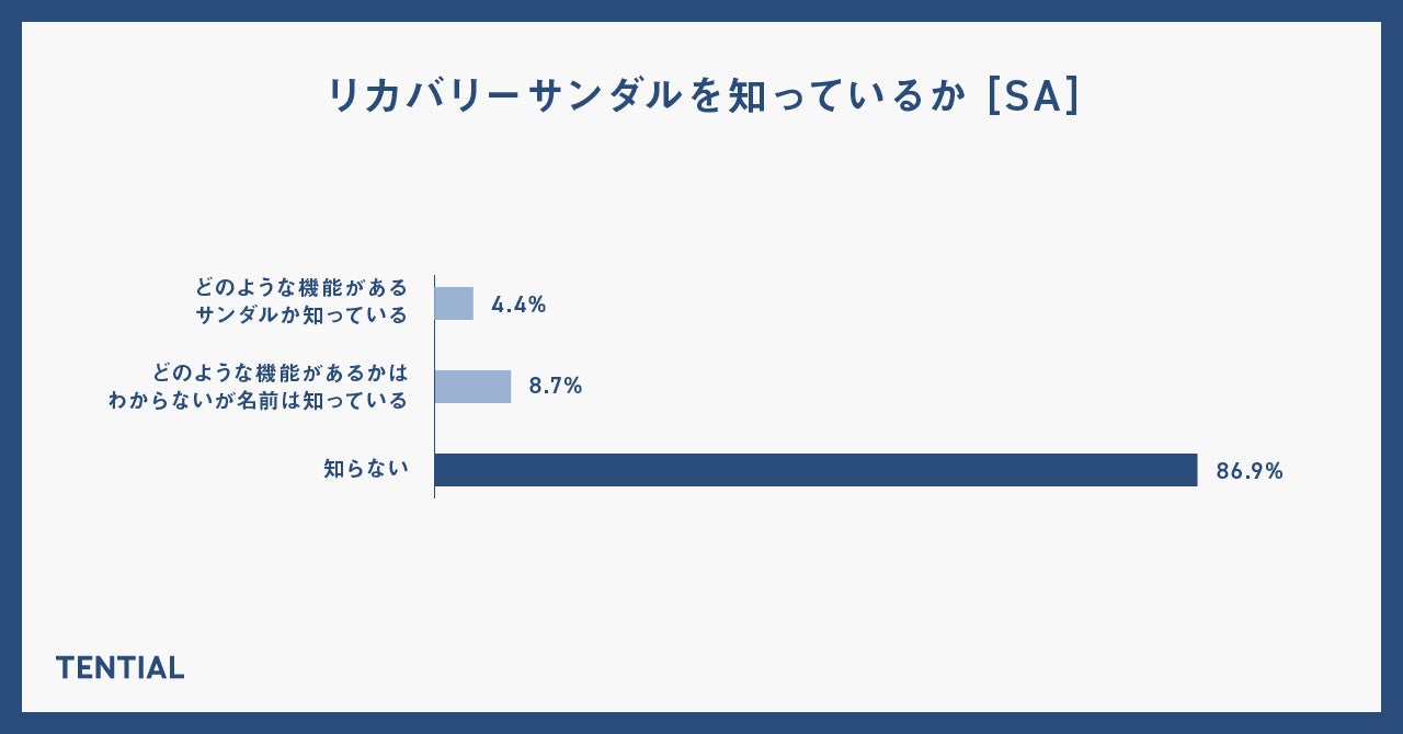 リカバリーサンダルを選ぶ時に重視したい項目として、「歩きやすさ」(57.4%)や「疲れにくさ」(47.5%)が価格を上回る結果となり、機能性を求める方が多い可能性を示しました。機能性を重視するリカバリーサンダルは足の悩みに対する対策方法がわからない方が多い現状において有用なツールとなりうる一方、そもそも知らない方が多く認知拡大が課題であるといえます。