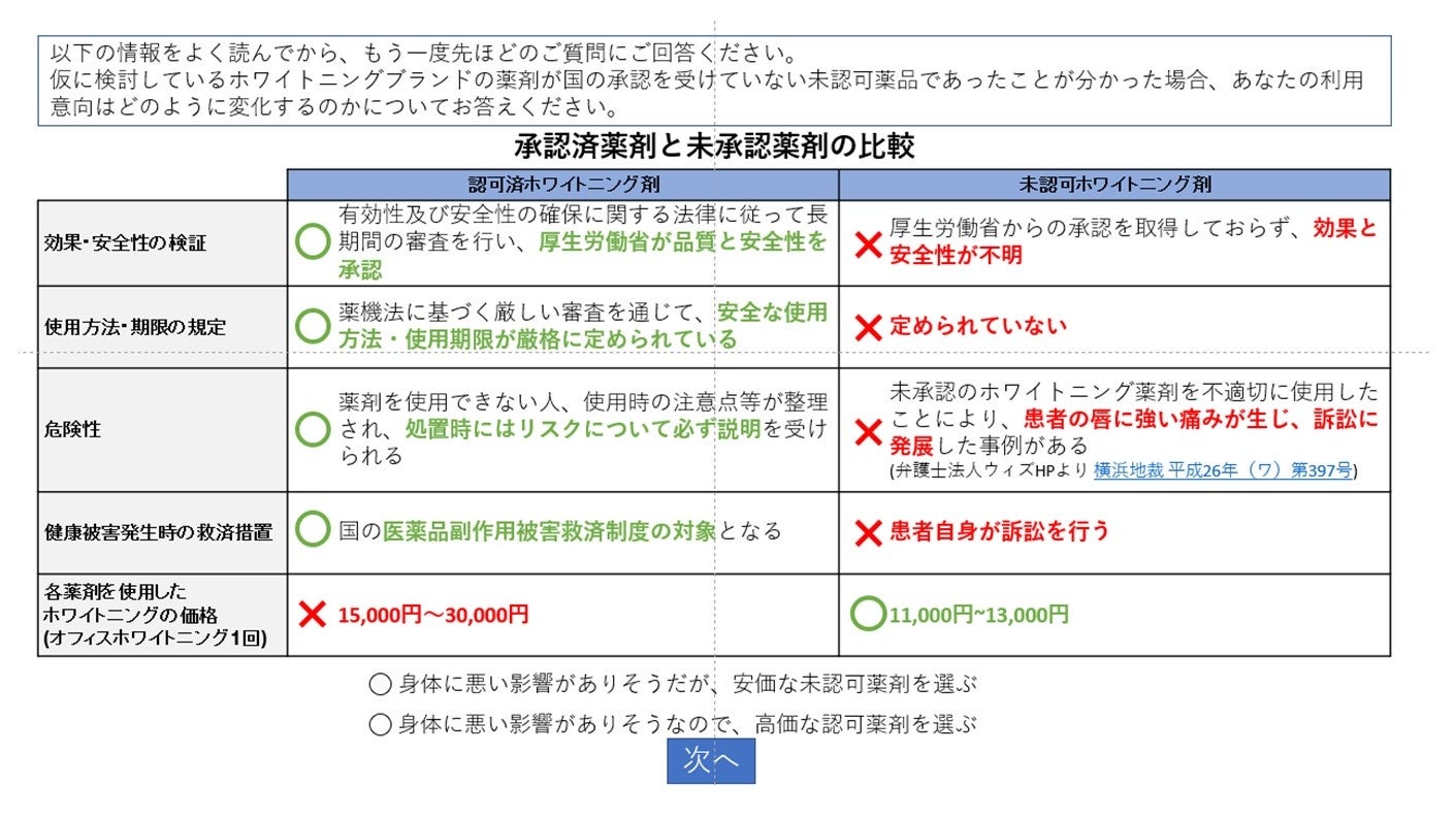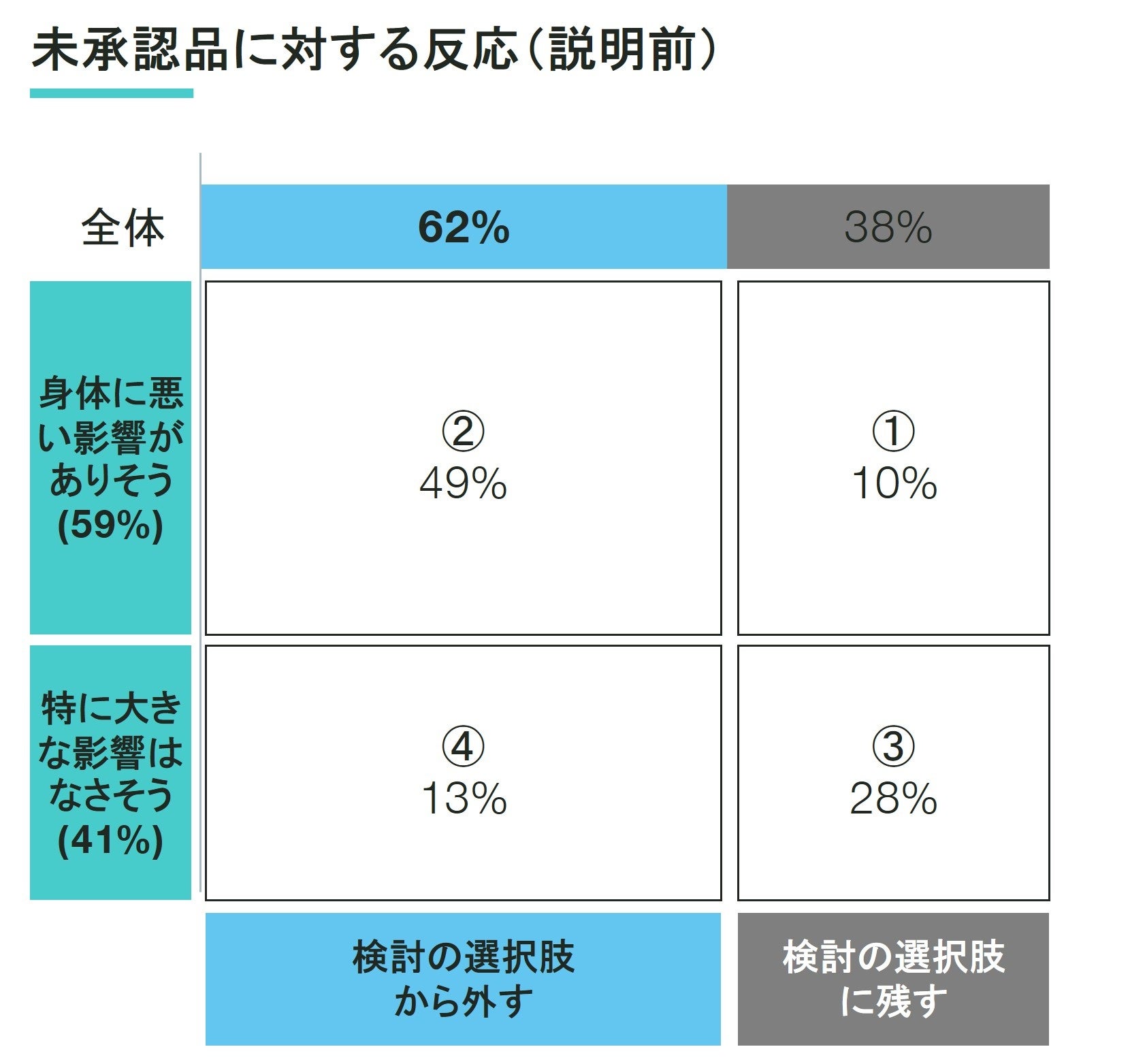 「未承認品」に対して「特に大きな影響はなさそう」と考えている方であっても、「未承認品」の具体的なリスクを認識した後は、多くの方が「認可薬剤を使う」ことを選択し、考え方に変化が生じることが明らかになりました。
