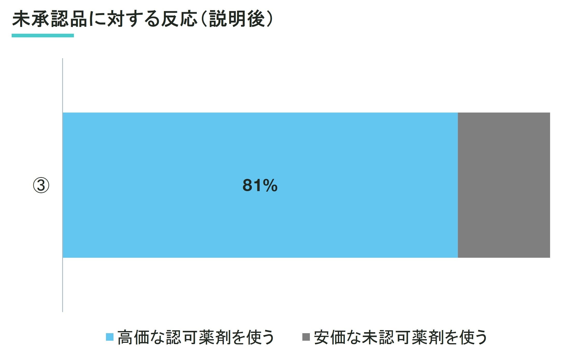 Q1の表のうち➂に該当する「“特に大きな影響はなさそう”で”検討の余地に残す“」と回答した方に、承認薬剤と未承認薬剤の説明画面を見せて、Q1と同じ質問したところ、8割を超える方が「高価な認可薬剤を使う」と回答しました。この明らかな変化から、「未承認品」に関するリスクを認識していなかった可能性が伺えます。
