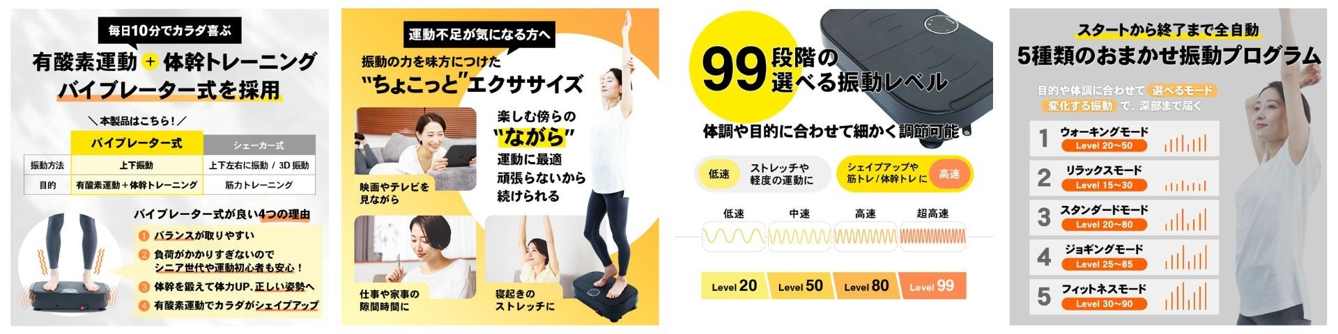 本製品の開発において最重視したのは、確かな機能性と利便性に裏打ちされたデザインのスマートさ。ECモールなどで販売されている数十種類のモデルとそのお客様の声を徹底分析し、よくある“いかにも健康器具”なデザインを覆し、引き算による機能美と上品なマットカラーで部屋に出しておきたくなる洗練された外観に仕上げました。また、マシン選びのポイントである振動については、3Dや上下左右の動きで主に筋力トレーニングをサポートするシェーカー式ではなく、運動に苦手意識を持つ方やシニア世代、産後のママにもお使いいただきやすいよう、上下振動を体幹で受け止めながら乗るだけで有酸素運動と体幹トレーニングを同時に行えるバイブレーター式を採用し、運動不足の解消や体力強化、スタイルアップなど幅広いニーズに対応しました。最大振動回数は1分間に850回の超高速スピードを実現しており、振動レベルは目的や体調、気分に応じて99段階の調節が可能です。さらに、5種類のオートモードを搭載しているため、忙しい方や運動初心者でも複雑な設定を行わずにクイックに運動を開始できるのも嬉しいポイントです。