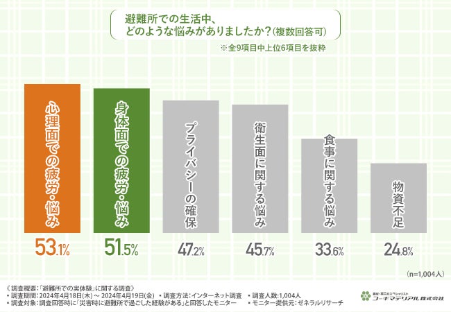 「避難所での生活中、どのような悩みがありましたか?(複数回答可)」と質問したところ、『心理面での疲労・悩み(53.1%)』と回答した方が最も多く、次いで『身体面での疲労・悩み(51.5%)』『プライバシーの確保(47.2%)』と続きました。