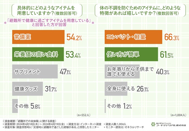 身体の不調を防ぐためのアイテムとして、持ち運びに便利で、簡単に使えるというニーズが高いことが示されることから、限られた空間でも使用でき、持ち運びに便利で誰でも使えるアイテムがあれば、避難所でも健康に過ごせる可能性が示唆されました。