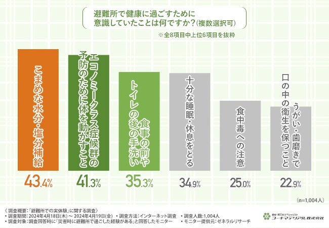避難所で健康に過ごすために意識していたことTOP3は「水分・塩分補給」「エコノミークラス症候群予防」「手洗い」