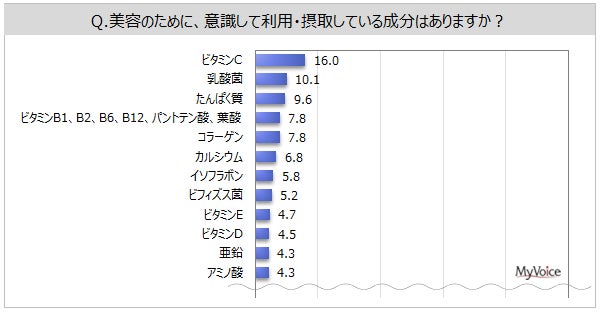美容のために意識して利用・摂取している成分は(複数回答)、「ビタミンC」が16.0%、「乳酸菌」が10.1%、「たんぱく質」が9.6%、「ビタミンB1、B2、B6、B12、パントテン酸、葉酸」「コラーゲン」「カルシウム」が7~8%です。