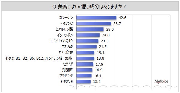 美容によいと思う成分は(複数回答)、「コラーゲン」が42.6%、「ビタミンC」が36.7%、「ヒアルロン酸」「イソフラボン」「コエンザイムQ10」「アミノ酸」が各20%台で上位となっています。