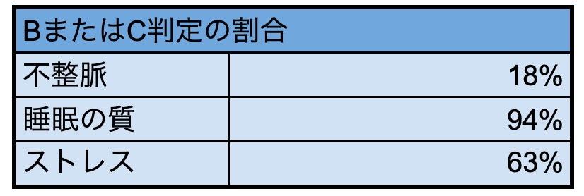 また、睡眠の項目でBもしくはC判定の方が94%、ストレスの項目でBもしくはC判定の方が63%でした。睡眠の質の低下やストレス過多な環境は、パフォーマンスの低下のほか、長期的に精神疾患などに繋がる可能性があり、注意が必要です。