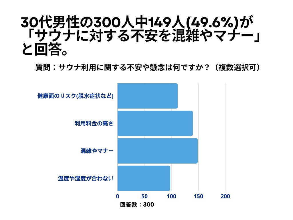 30代男性の300人を対象とした「サウナ利用に関する不安や懸念は何ですか?」というアンケートで149人(49.6%)が「混雑やマナー」という結果になりました。