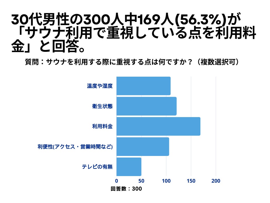 30代男性の300人を対象とした「サウナを利用する際に重視する点は何ですか?」というアンケートで169人(56.3%)が「利用料金」という結果になりました。