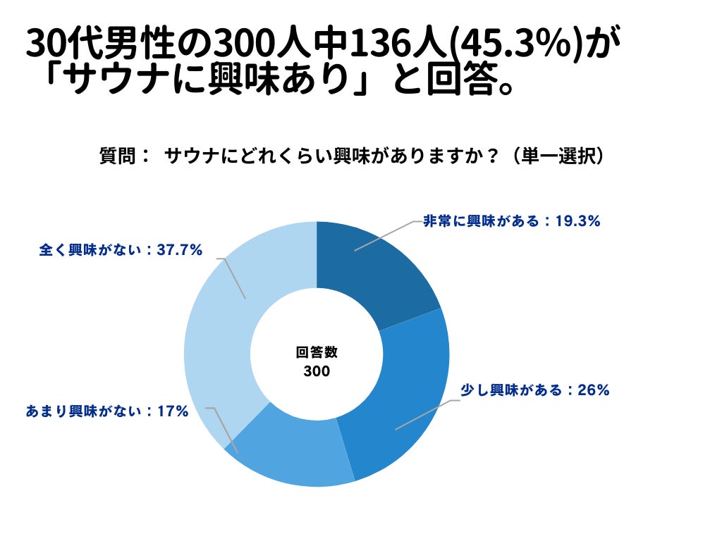 30代男性の300人を対象とした「サウナにどれくらい興味がありますか」というアンケートで136人(45.3%)が「サウナについて興味あり」という結果になりました。