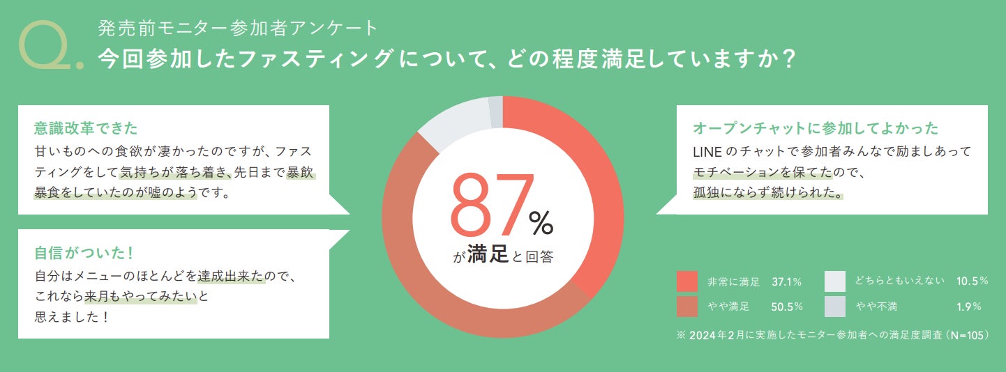 発売前に実施したファスティングイベントの参加者に実施したアンケートでは、87%の方から「満足した」と回答いただきました。