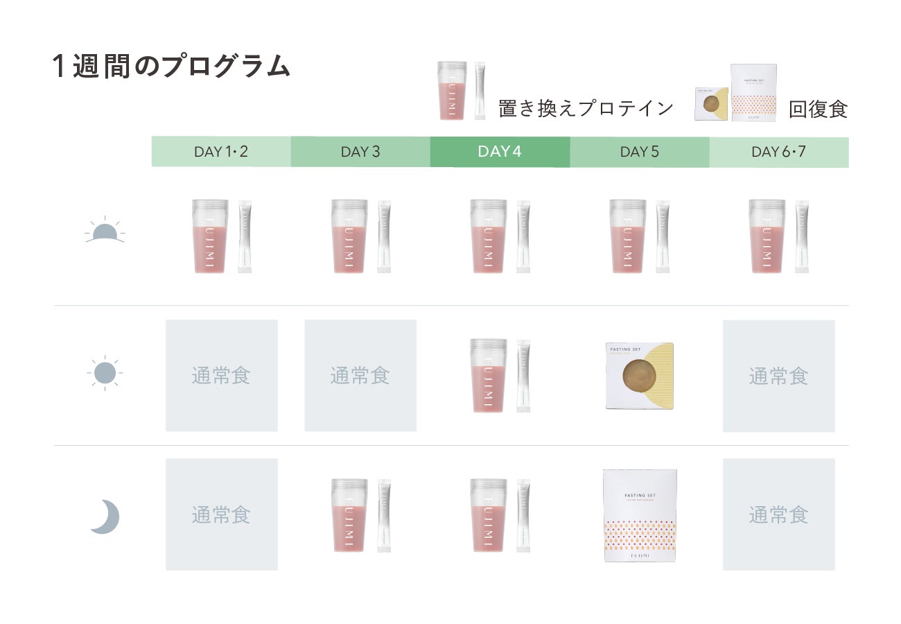 FUJIMIのファスティングプログラムで期間中に食事をとらないのはたった1日だけ。